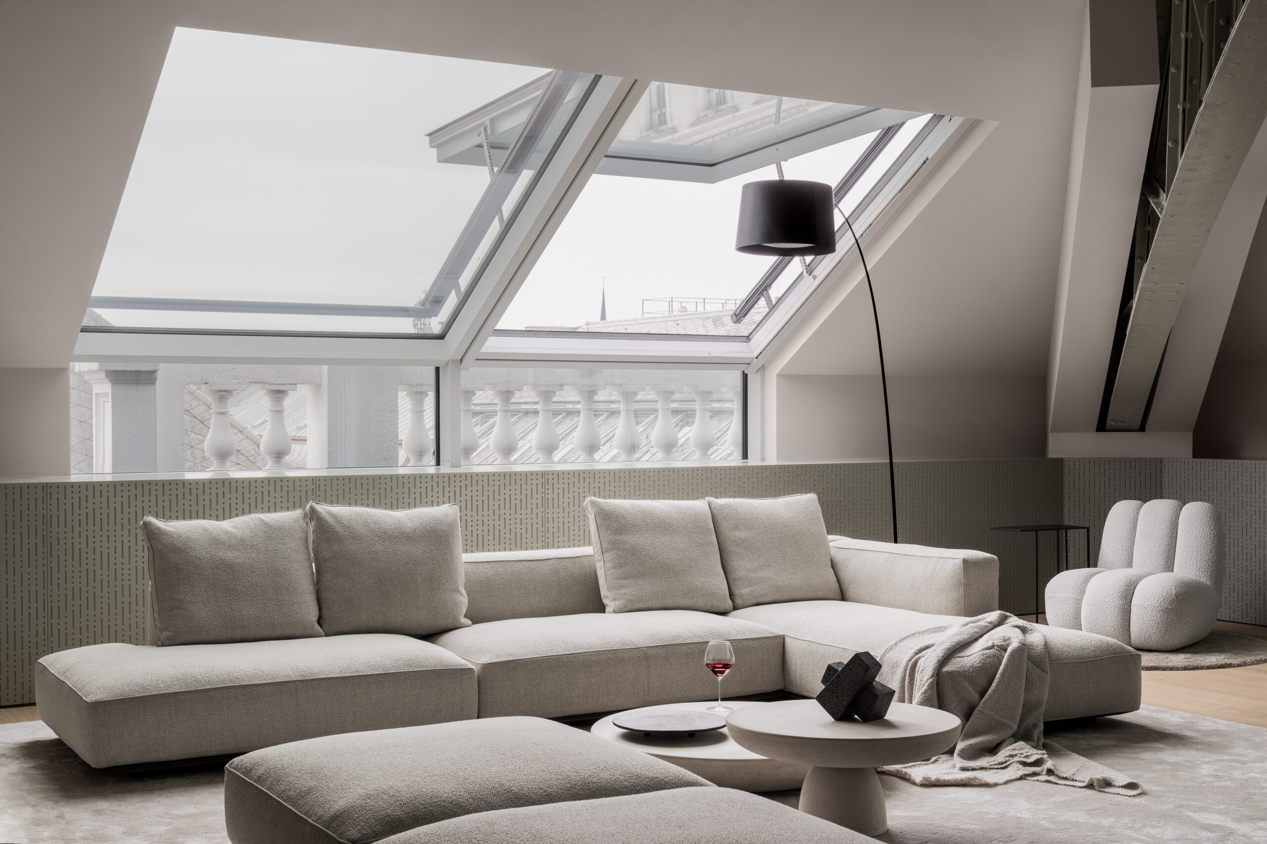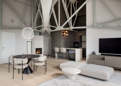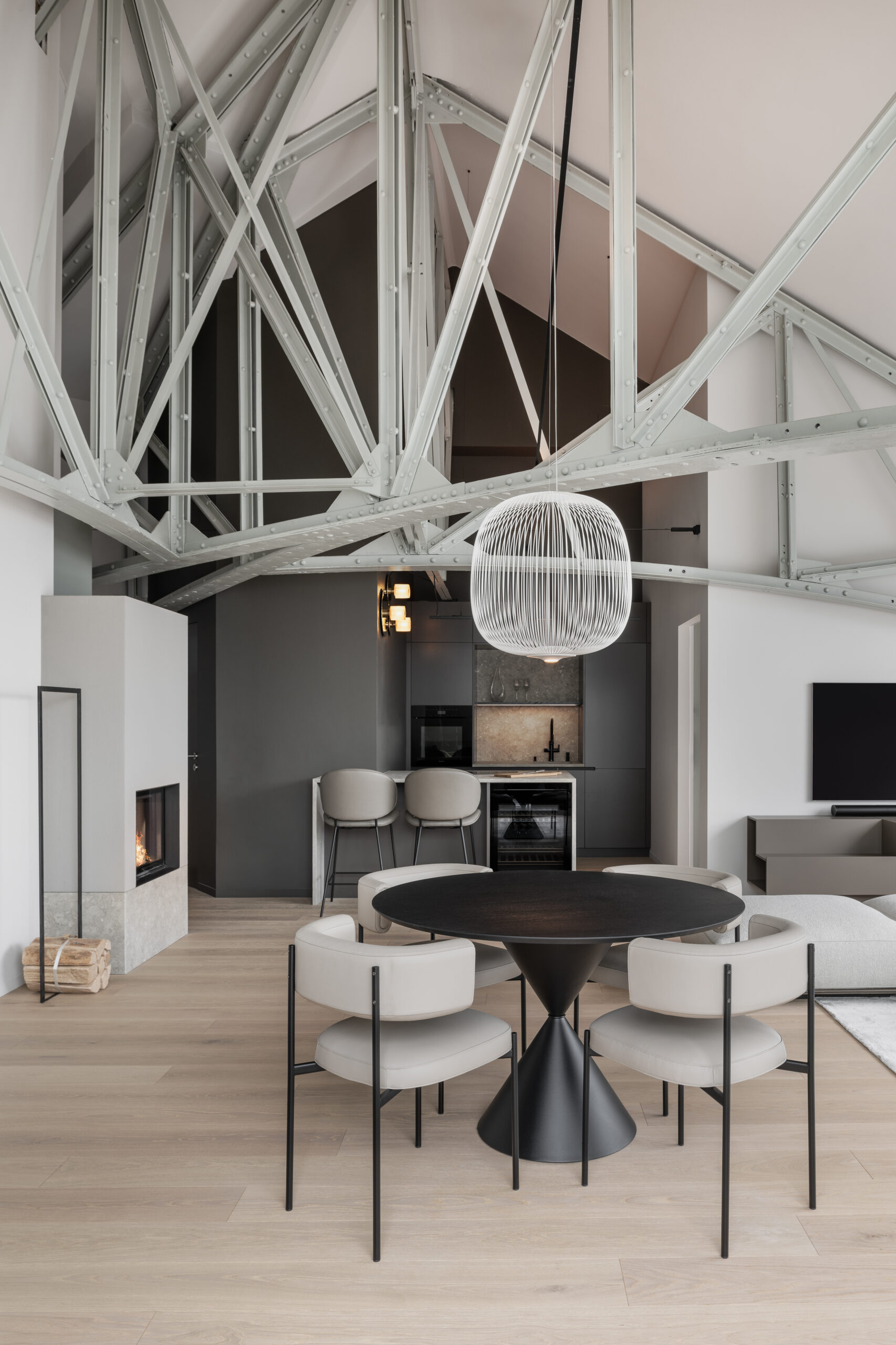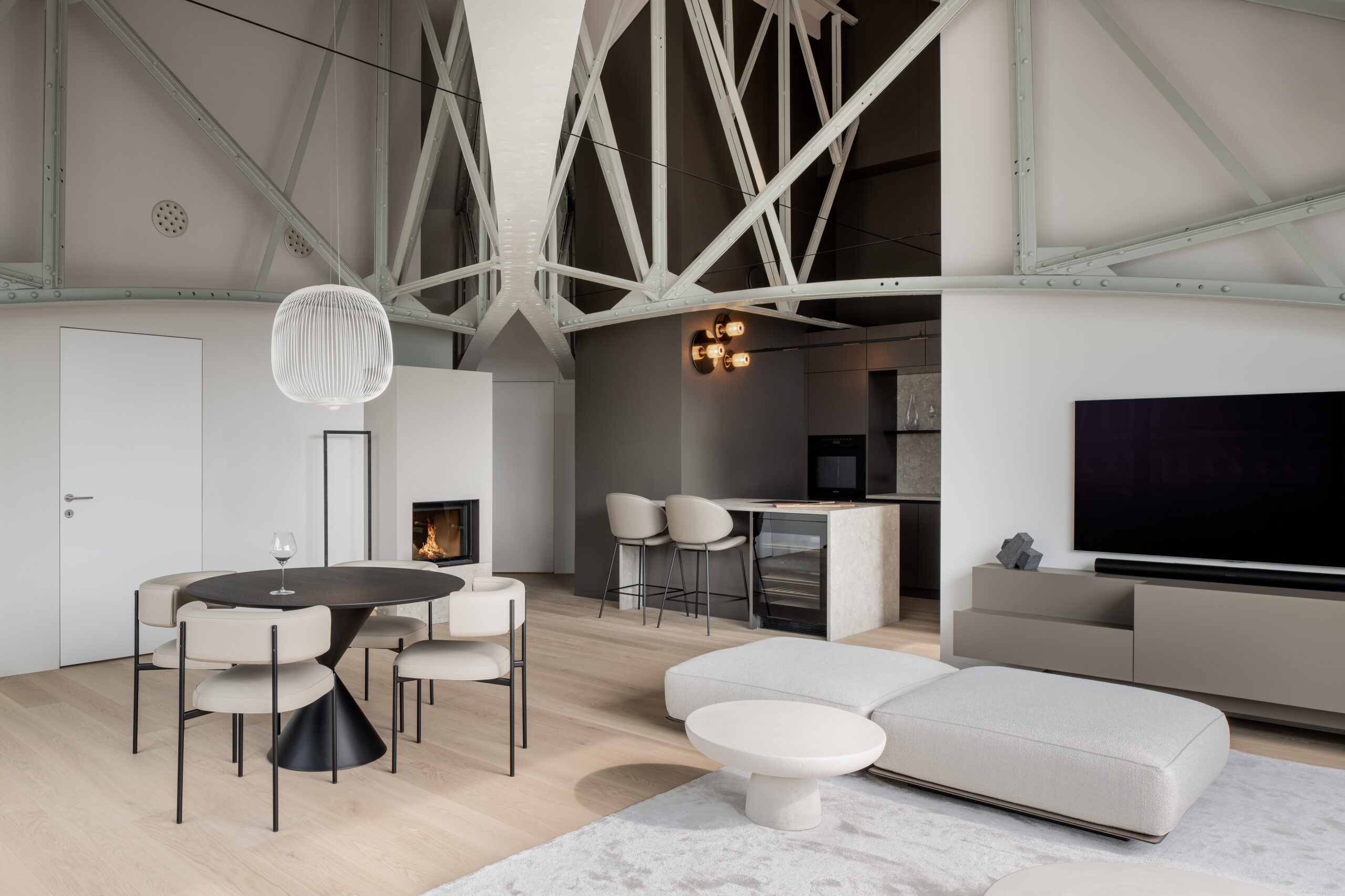 Beim Lichtkonzept wurde besonderes Augenmerk darauf gelegt, den Dachraum mit indirektem Licht in Szene zu setzen. Den technisch anmutenden Elementen wurden in den Stellmöbeln weiche Formen und Farben als Kontrast gegenübergesetzt, um eine wohnliche Atmosphäre zu schaffen.