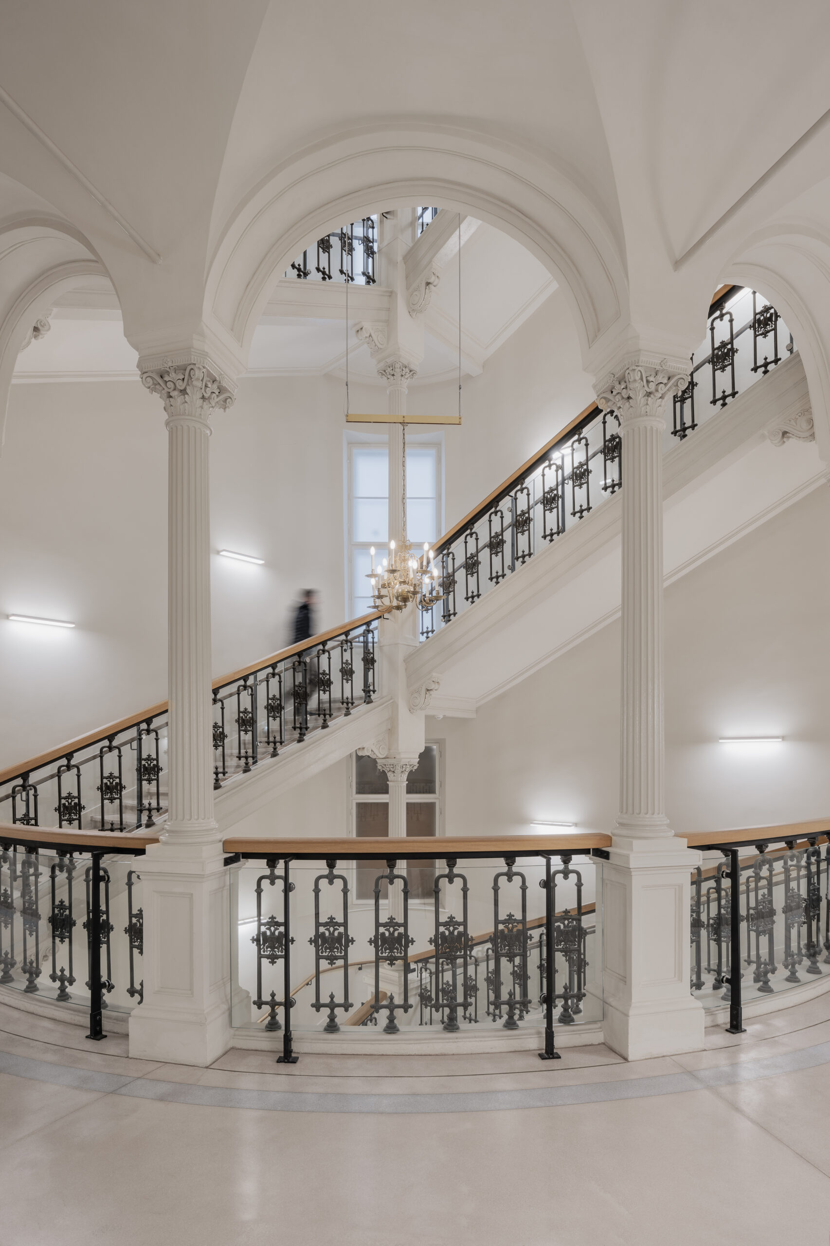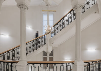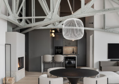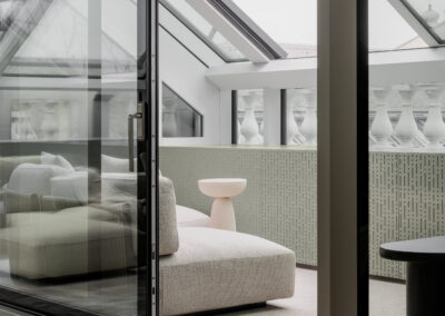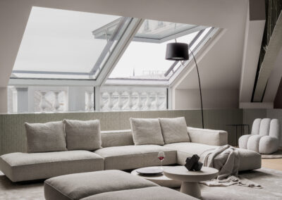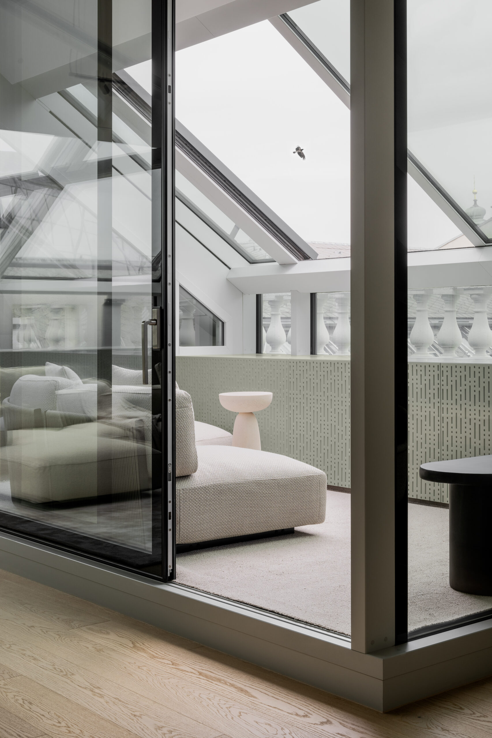 Das Penthouse befindet sich im Dachgeschoß der ehemaligen k.k. Telegrafen Centrale in Wien am Börseplatz 1. Die Wohnung wird von der historischen Stahlfachwerkskonstruktion überspannt die der Immobilie einen einzigartigen Charakter verleiht. Um dieser Konstruktion eine entsprechende Basis zu verleihen wurde die bestehende, umlaufende Brüstung neu verkleidet.